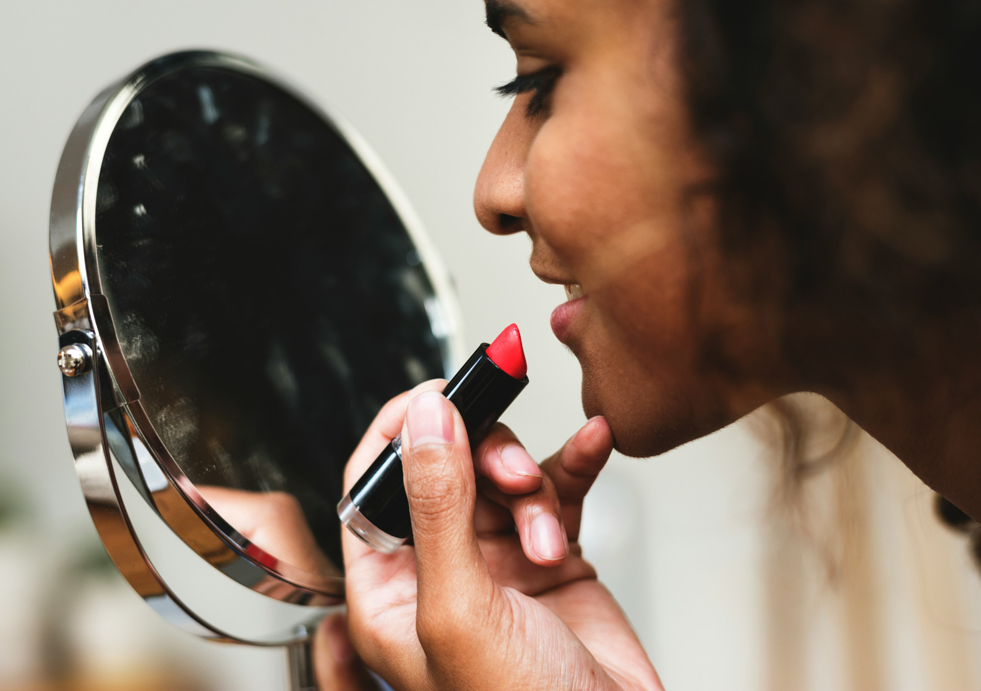 Prova färgen i naturligt ljus och välj utifrån din hudtons underton. Varma hudtoner passar bra med korall- och orange-röda färger, medan kalla hudtoner passar bra med blåaktiga röda och bärfärger.